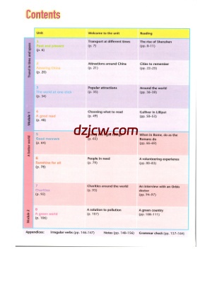 Unit 1 Past and present Unit 2 Amazing China Unit 3 The world at one click Unit 4 A good read Unit 5 Good manners Unit 6 Sunshine for all Unit 7 Charities Unit 8 A green world